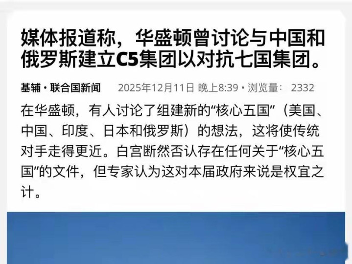 一则“美国欲组建美中俄日印‘核心五国集团’(C5)”的爆料,掀起轩然大波。这一构想将取代G7、跳出G2二元框架,却将欧洲盟友彻底排除在外,被俄联邦安全会议副主席梅德韦杰夫直言是对欧洲的“公然羞辱”。就在舆论热议美国是否要重构全球治理格局时,白宫紧急否认存在相关机密战略文件,这场“爆料-否认”的闹剧,实则暴露了美国霸权逻辑下的战略焦虑。